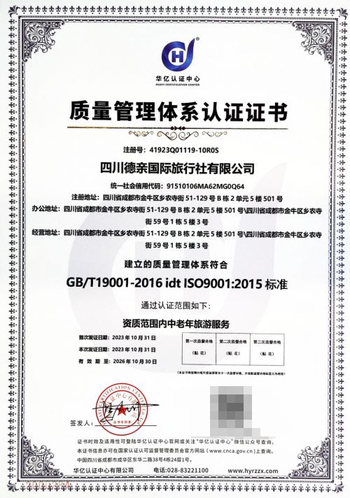 2023年10月31日,四川德親國際旅行社有限公司(以下簡稱“四川德親國旅”)獲得“ISO9001質量管理體系認證證書”,是四川省首家也是唯一一家中老年旅游服務獲得此項認證的旅行社企業。