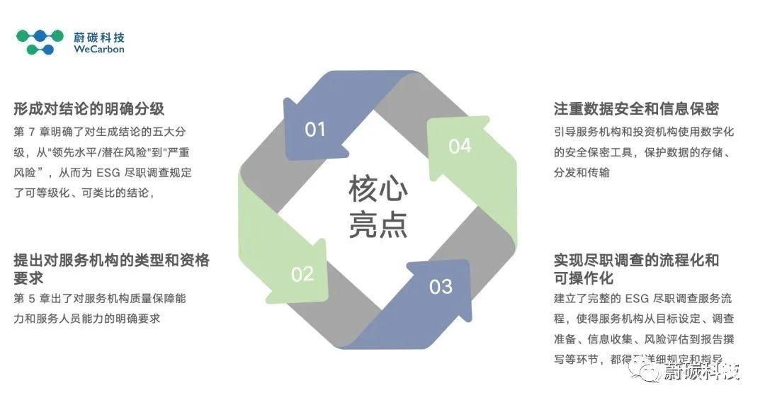 在本次標準制定過程中,蔚碳科技負責起草了標準的主要內容。同時,蔚碳科技依托長期從事 ESG 盡職調查的海內外一線實操經驗,將標準融入落地化、實用化、國際化元素,確保該標準能為投資機構、服務機構提供切實可行的工作指引。后續,蔚碳科技將持續推動該標準在央國企及民營投資機構中的推廣,并一如既往為投資機構提供包括 ESG 盡職調查在內的 ESG 投資咨詢服務支持,協助各類投資機構揭示環境、社會及公司治理相關風險和機遇,并充分將 ESG 融入投資決策的全流程。