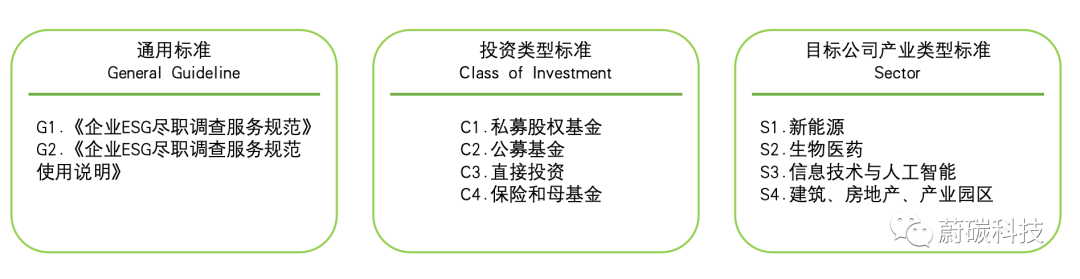 企業 ESG 盡職調查系列標準包含通用標準、投資類型標準、目標公司產業類型標準。ESG 盡職調查應當首要參照通用標準。根據其投資類型和目標公司產業類型,還應同時參考一份投資類型標準和一份目標公司產業類型標準。