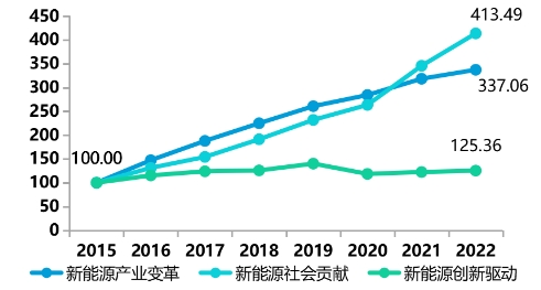 新能源社會貢獻分項指數增長最快,2022年升至413.49點,同比增長19.70%,表征內蒙古經濟效益和生態效益實現共贏。近年來,內蒙古堅持以生態優先、綠色發展為導向,大力發展新能源產業,能源供給多元化進一步增強,同時帶動地區經濟發展和環境改善。風電、太陽能產業稅收貢獻和產值逐年上升,形成初具規模、發展勢頭良好的新能源產業集群;新能源開發利用取得明顯成效,光伏產業與生態經濟實現融合發展。