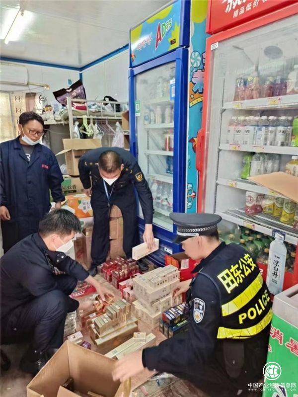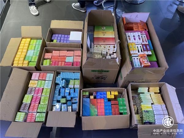 圖為樂業縣煙草專賣局聯合市場監督管理局、公安局對樂業縣城電子煙市場清理專項行動。查獲“奶茶杯”、“可樂杯”等“三無”電子煙一批。(韋定平/攝)