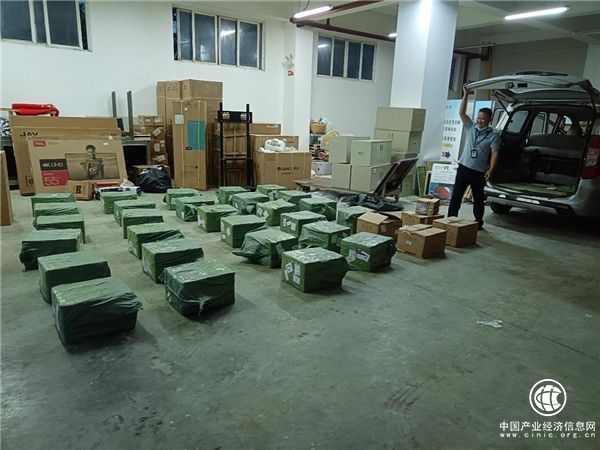圖為百色市靖西煙草專賣局聯合執法部門查獲首例非法入境電子煙案件現場清點涉案物品。(李文武/攝)