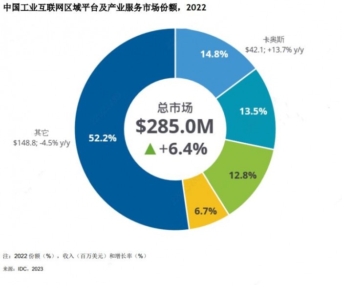 報告中提到,2022年中國工業互聯網平臺區域平臺及服務市場規模達到2.85億美元,同比增長6.4%,不同細分領域分化較為明顯。區域平臺市場需求相對疲軟,工業互聯網園區及產教融合則保持了較好的增長勢頭。市場集中度方面,卡奧斯COSMOPlat等4家工業互聯網平臺仍占據市場重要比重。