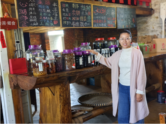 在郭松的啟發下,黃芳還準備了一些特色手工藝品和當地的農產品擺放在小店里。她找來村里的村民,從他們那里購買新鮮的農產品,如水果、蔬菜、特色米酒等等,還讓村民制作了獨特的土陶和織品,擺放在店內,更添鄉土韻味。
