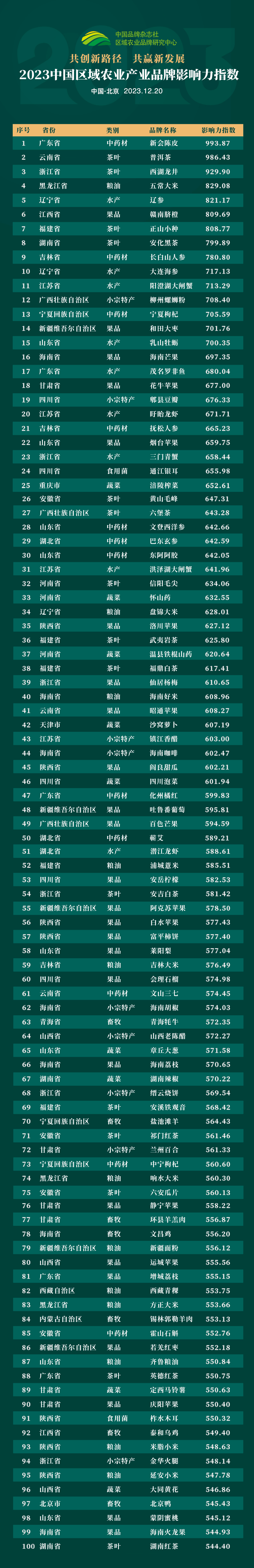 “2023 中國區域農業產業品牌影響力指數”公布如下: