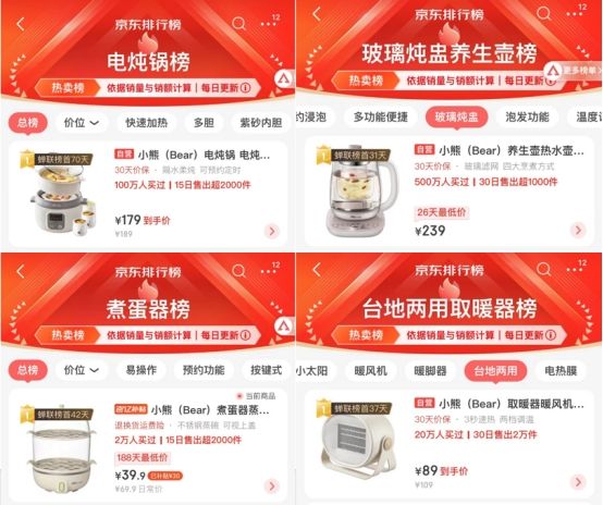 在小家電領域,小熊電器正憑借著精品優勢,在“暖經濟”熱潮中“一路升溫”。據京東數據顯示,小熊電器多款產品位居京東熱賣榜首,包括霸榜電燉鍋榜、小容量養生壺榜、煮蛋器榜、臺地兩用取暖器榜等多榜TOP1,而且爆品銷量快速攀升,成為這個冬天越來越多年輕人享受精致生活的首選。