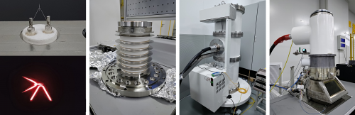 圖左一 電子源針尖與高溫比色 圖左二 電子加速陶瓷管 圖右一 200kV熱發射電子槍 圖右二 超高穩定度高壓電源