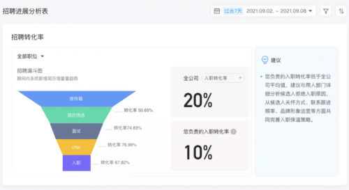 大部分企業招聘的思路其實只能解決當下的燃眉之急,而缺少發展的眼光,如果將招聘的目標定為招聘未來的人才,那么企業就會提前預測企業未來人才的需求。用友人才發展就可以把藏于數據之下的洞察,全部給到決策者,幫助HR掌握自身招聘工作的情況,系統還會基于招聘數據指出瓶頸環節,給予招聘流程改進建議,讓人才洞察變得觸手可及,幫助企業預見招聘趨勢,預見適宜組織發展的人才。