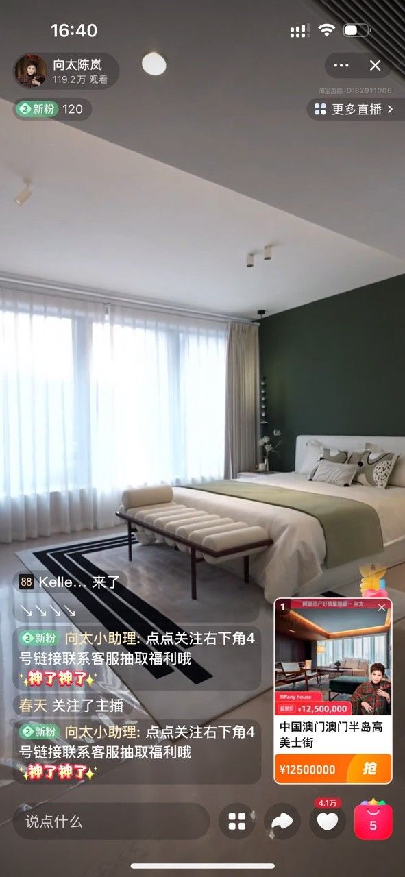 1月9日,阿里資產聯合向太Tiffany陳嵐開啟了淘寶直播,帶領大家深度體驗了澳門“理想家”Tiffany house。論顏值,一見傾心再見傾情;論設計,前不見古人后不見來者。包括建筑立面、燈光、兒童公共空間等都拿過設計大獎,讓人頗為震撼。此次直播中,網友們也見證了向太作為阿里資產全國首個房產星推官的加冕儀式。