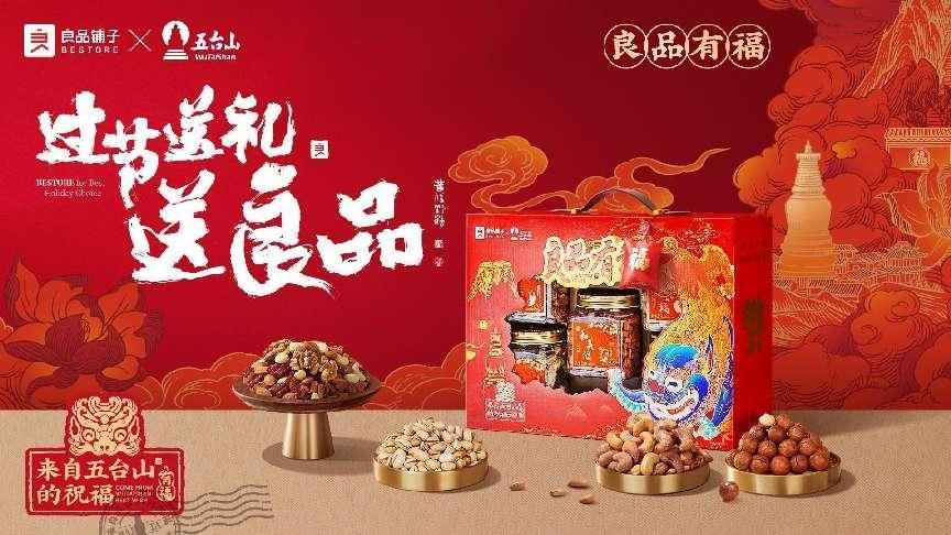 “良品有福”年貨禮盒外觀印有青獅、蓮花、大白塔等代表福氣祥瑞的五臺山標志,寄托美好寓意,將“來自五臺山的祝福”送入千家萬戶。禮盒分為“良品鈺瑞禮”“良品頌福禮”“良品臻悅禮”三大主推款,每一款都主打高品質堅果并賦予了美好寓意。以“良品頌福禮”為例,內有紫衣腰果、澳洲夏威夷果、美國巴旦木、每日堅果、琥珀核桃仁五款爆款堅果產品,同時取堅果之諧音與特質,分別寓意鴻運福、成功福、和諧福、健康福、常青福。此外,再搭配買禮盒抽福卡活動,開門納福、出門送福、職場派福、福氣滿滿等來自五臺山的“福氣連連”福包,一舉擊中Z世代的喜好。