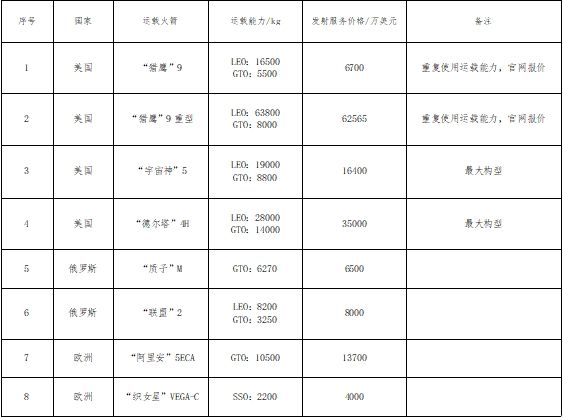 注:本表格數據來源于《中國航天》整理的中國長城工業集團有限公司和北京航天長征科技信息研究所,此外均選取各自火箭對應其發射場的最大運載能力進行分析。