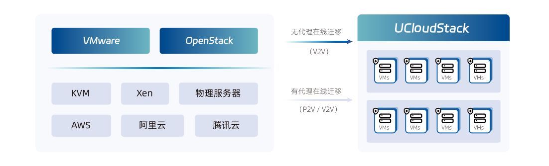 平臺的切換勢必將面臨系統遷移問題,UCloudStack提供異構環境平滑遷移能力,支持VMware和OpenStack的無代理在線遷移,并支持KVM、物理服務器和主流公有云的 有代理在線遷移,可保障業務不中斷的情況下進行在線遷移。