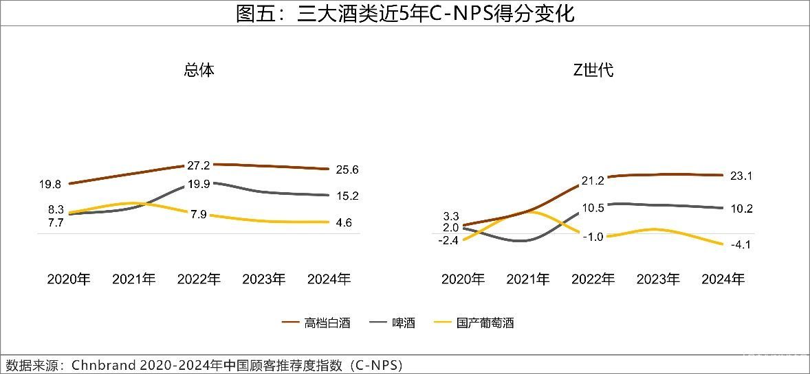 我們選擇了三組具備共性的品類,第一組是酒類品類組,從數據中可以看到,近5年三大酒類的C-NPS表現出不同的發展趨勢。高檔白酒和啤酒品類均呈波動上升的發展態勢,尤其是高檔白酒在Z世代群體中的得分從2020年的3.3分提升至23.1分,而國產葡萄酒C-NPS得分持續下滑,消費者體驗面臨困境。