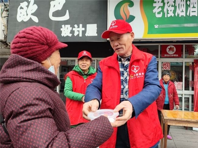 圖為樓祖安與“香溢”志愿者攜手為周邊居民送元宵
