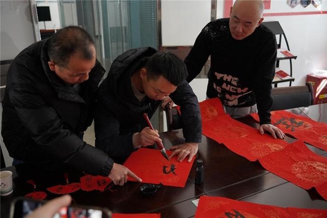 不會寫毛筆字的,也忙碌著幫忙擺放紙張、抻對聯,把寫好的春聯、福字擺好晾干,空氣中似乎都洋溢著春節即將到來的喜慶氣氛。