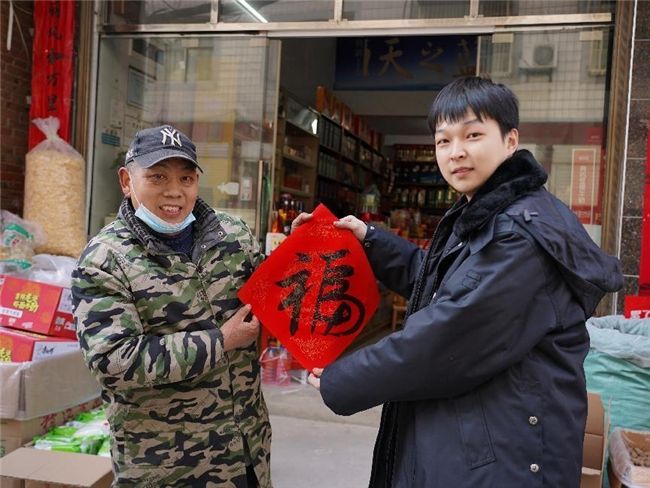 “謝謝啊,這是你們自己寫的吧,寫的真好,過年我就貼我們家門上。”顏老板接過“福”,笑呵呵接話。