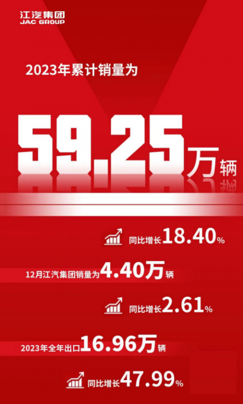 2023年,江汽集團累計銷售59.25萬輛,同比增長18.40%。其中,國際業務規模效益實現雙增長,持續鞏固海外市場地位;中高端輕卡連續多年位列中國出海品牌首位;皮卡位列中國皮卡出口前三位;多功能商用車在歐系左舵市場出口銷量位居行業第一;新能源汽車攜手20余家全球500強企業,做大做強海外“朋友圈”。