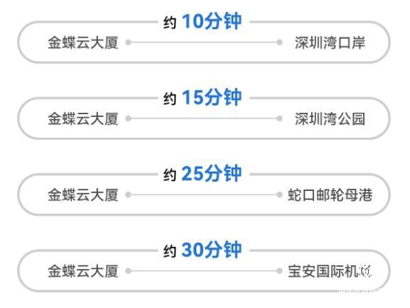飛機、游輪、車流、地鐵站,車馬水龍人來人往,驅動著這座城市向前。商務所需的出行方式,都已經圈定在金蝶云大廈的半小時出行圈內。深圳主干道沙河西路、濱海大道、深南大道交匯,駕車上下班、商務出行一路暢通。10 分鐘直達深圳灣口岸,25分鐘登上蛇口郵輪母港,半小時內直抵寶安國際機場。從這里出發,觸及世界的精彩。