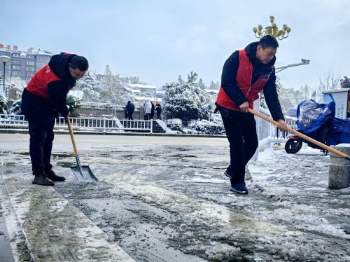 盡管寒風凜冽,但全體人員斗志昂揚,鐵鍬翻飛、掃帚舞動,志愿者們或三五組隊,或兩人協力,或一字排開協同推進。經過1小時的持續奮戰,道路兩旁及鐵索橋上的積雪厚冰已清掃得干干凈凈,為往來群眾清掃出一條干凈、整潔、暢通的安全通道,用實際行動努力破解極端天氣拋出的“民生考題”,向轄區居民傳遞了冬日里的關懷與溫暖。