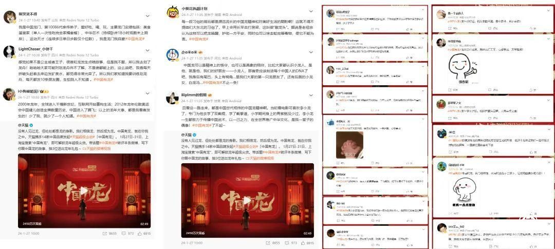 微博上,#中國有龍#話題躋身熱搜第三,總閱讀量達3.5億,收獲4000+自來水,其中,@中國日報、@白鹿視頻、@搜狐千里眼、@東方網等40余家藍V媒體自發加入片子的傳播行列,同時,@老師我叫何同學等眾多青年代表、KOL也加入討論陣營,實現了片子的進一步破圈傳播。
