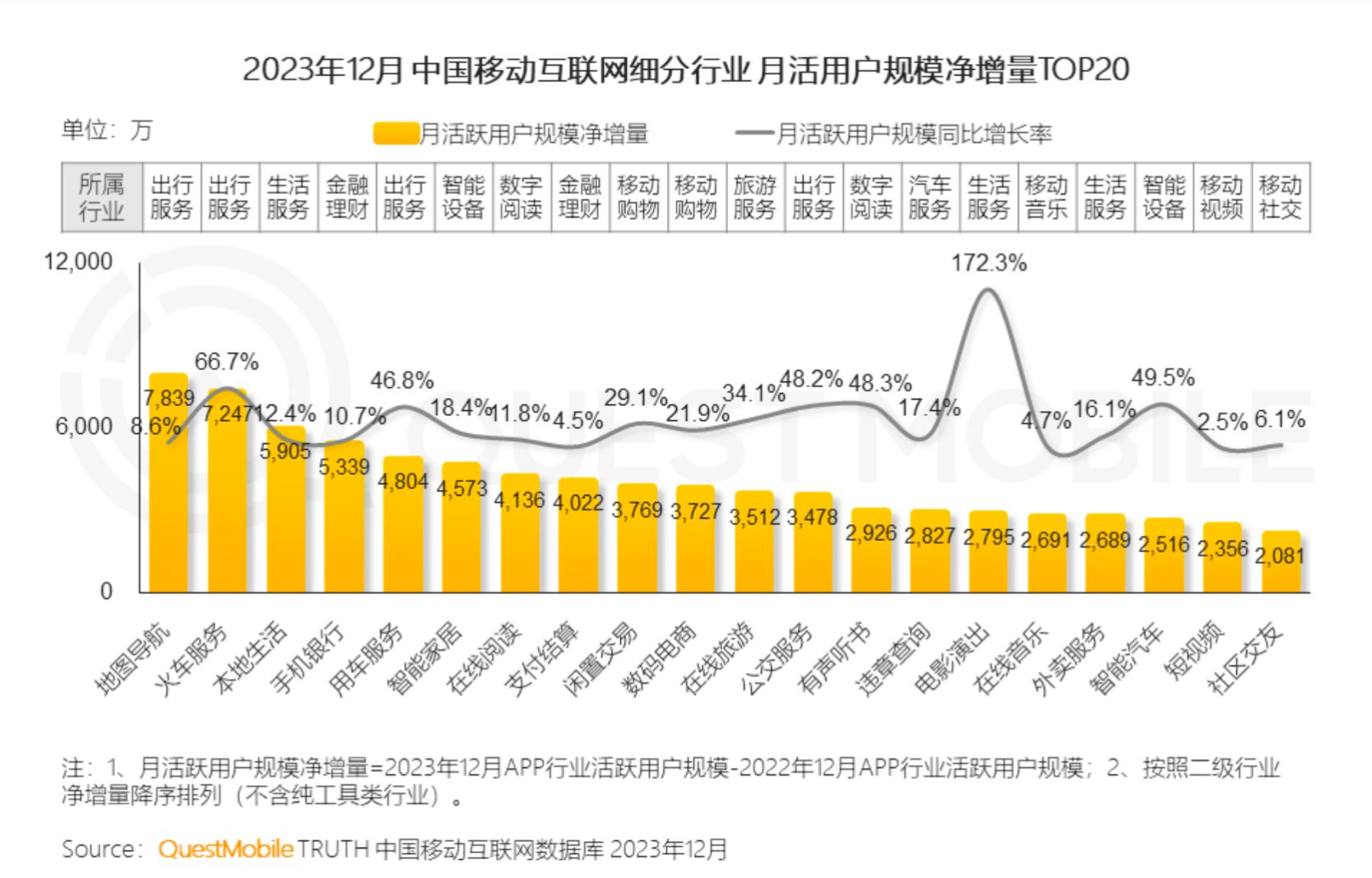 與線下相關的線上應用出現了持續、高速的逆勢增長。例如,堪稱體驗消費之王的文旅消費就是典型,2023年,文旅消費相關的電影演出、火車服務、用車服務、在線旅游等,同比分別增長了172.3%、66.7%、46.8%、34.1%;當然,市民生活相關的消費同樣如此,公交服務、閑置交易、外賣服務、本地生活也繼續火熱,分別增長了48.2%、29.1%、16.1%、12.4%。