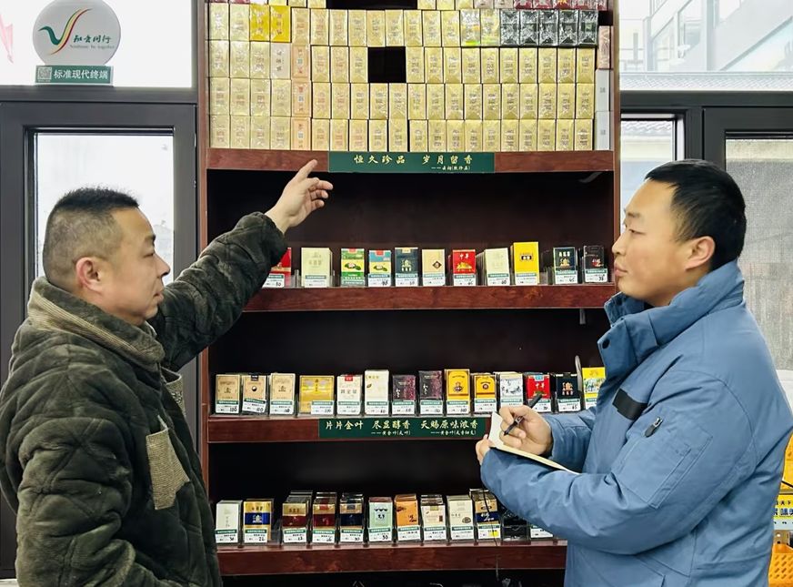 “王老板,馬上不是要過年了,最近又上了幾款新品卷煙,我來給你補一下標簽,另外我想你的店鋪可以加入一些春節個性化陳列元素,來營造節日氛圍。”鐘永峰一邊打著標簽,一邊環顧四周幫王老板思考著特色經營策略。