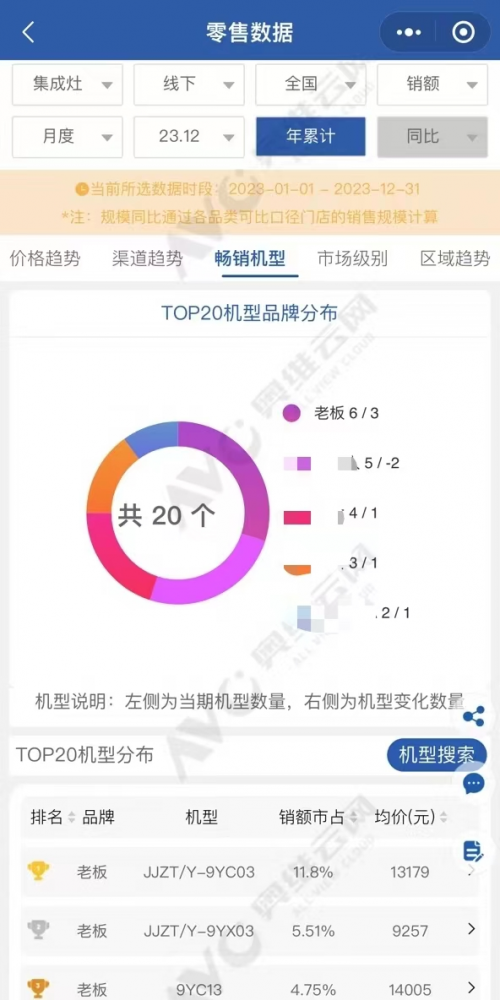 當下,廚電一體化、智能化的新趨勢,讓集成灶在市場受到熱捧。據奧維云網2023年1月-2023年12月線下零售數據監測,老板全新一代高性能集成灶銷額銷量雙料第一,整個2023年獨占鰲頭,備受行業矚目。具體來看,在“集成灶暢銷機型市占率TOP20”中,老板高性能集成灶9YC03、9YX03和9YC13霸榜前三,勢不可擋。