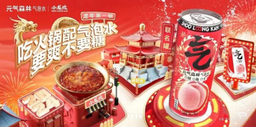 在成都,元氣森林與小龍坎合作開設了一家主題店。這家店不僅提供火鍋美食,還特別推出了330ml易拉罐裝的白桃味氣泡水。這款氣泡水采用了特別定制的龍年紅色包裝,既彰顯了傳統文化的魅力,又與火鍋的熱烈氛圍相得益彰。在火鍋的油膩和辣味之間,這款氣泡水成為了消費者們的解油解辣最佳搭檔。