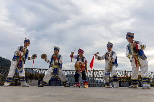 (圖為文際忠(中)與村民一起義務表演圍鼓)