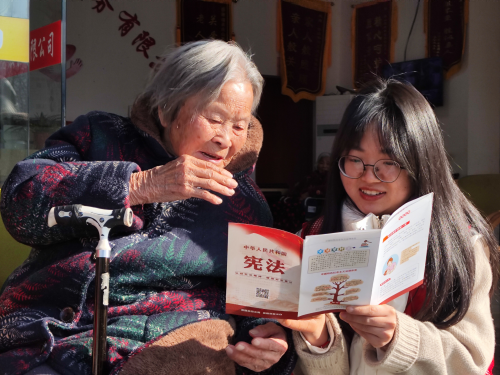 圖為志愿者向老人講解憲法知識。朱修范 攝