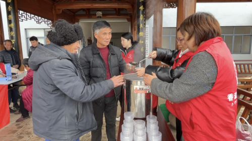 圖為“香溢”志愿者向村民分發暖心姜茶。