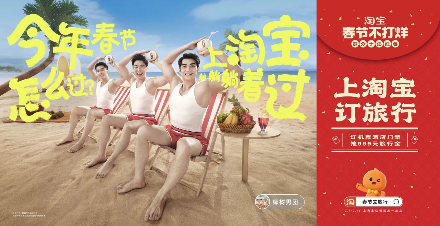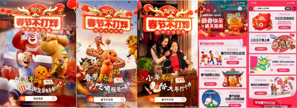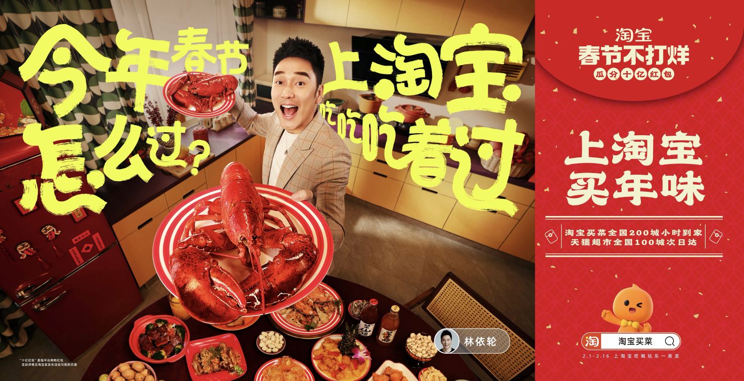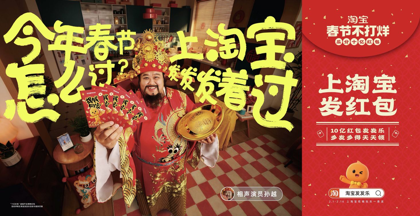 淘寶邀請相聲演員孫越、頭部主播李佳琦、歌手林依輪等明星主播,及東方甄選、椰樹男團等人氣直播間共同發聲,圍繞“淘寶式過年”的幾大場景,詮釋了“萬能的淘寶”。一起上淘寶,發紅包發著過、買年貨逛著過、買年味吃著過、看直播鬧著過、訂旅行躺著過、買電影票笑著過大年!