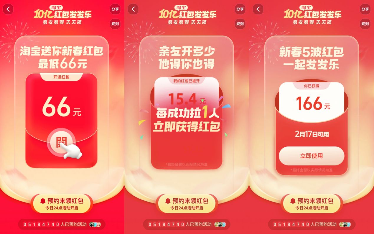 2月5日至17日,淘寶在春節期間總共會發?5 波紅包,不僅自己可以拆紅包,還能邀請好友一起拆紅包。好友拆多少,你就得多少,每次拉人都有紅包,無需攢滿立即發放!