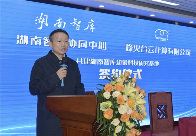 2月5日上午,湖南智庫協同中心與烽火臺云計算有限公司共建湖南智庫幼象科技研究基地(課題組)簽約儀式在長沙舉行。湖南省人民檢察院原檢察長張樹海,中共湖南省委統戰部原副部長朱振基,國家發改委宏觀經濟管理專家委員會專家、研究員、湖南發展研究中心主任、博士智庫基金管理委員會主席、湖南智庫協同中心主任王超,湖南智庫協同中心秘書長胡景禎,烽火臺云計算有限公司副董事長周晚生,董事劉小琛等出席簽約儀式。