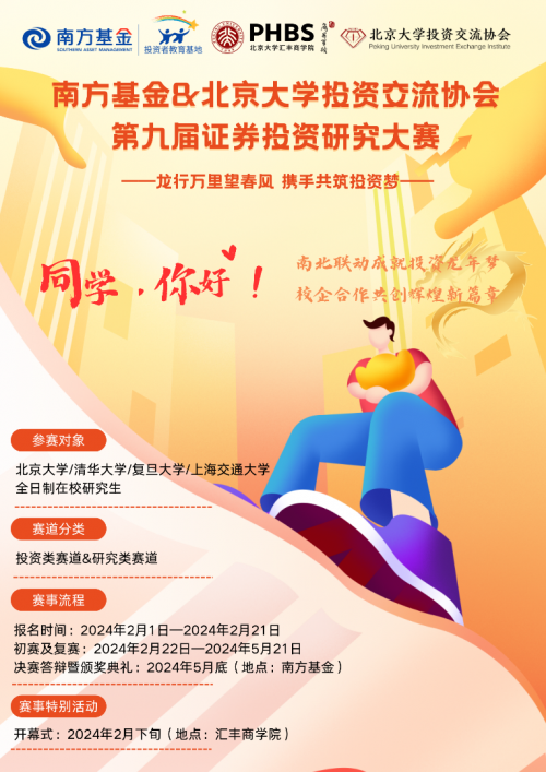 青年,肩負著實現中華民族偉大復興的使命,是國家和民族的希望。為落實二十大新時代人才強國戰略,做好青年人才的教育與培養,助力投資者教育工作納入國民教育體系,南方基金積極響應中國證券投資基金業協會發起的“一司一省一高校”投教活動,與北京大學攜手,共同打造“同學,你好”第九屆證券投資研究大賽。本次活動將為廣大高校學子提供一個展示自我投資研究能力的平臺,讓青春的熱情與投資的智慧在此碰撞。