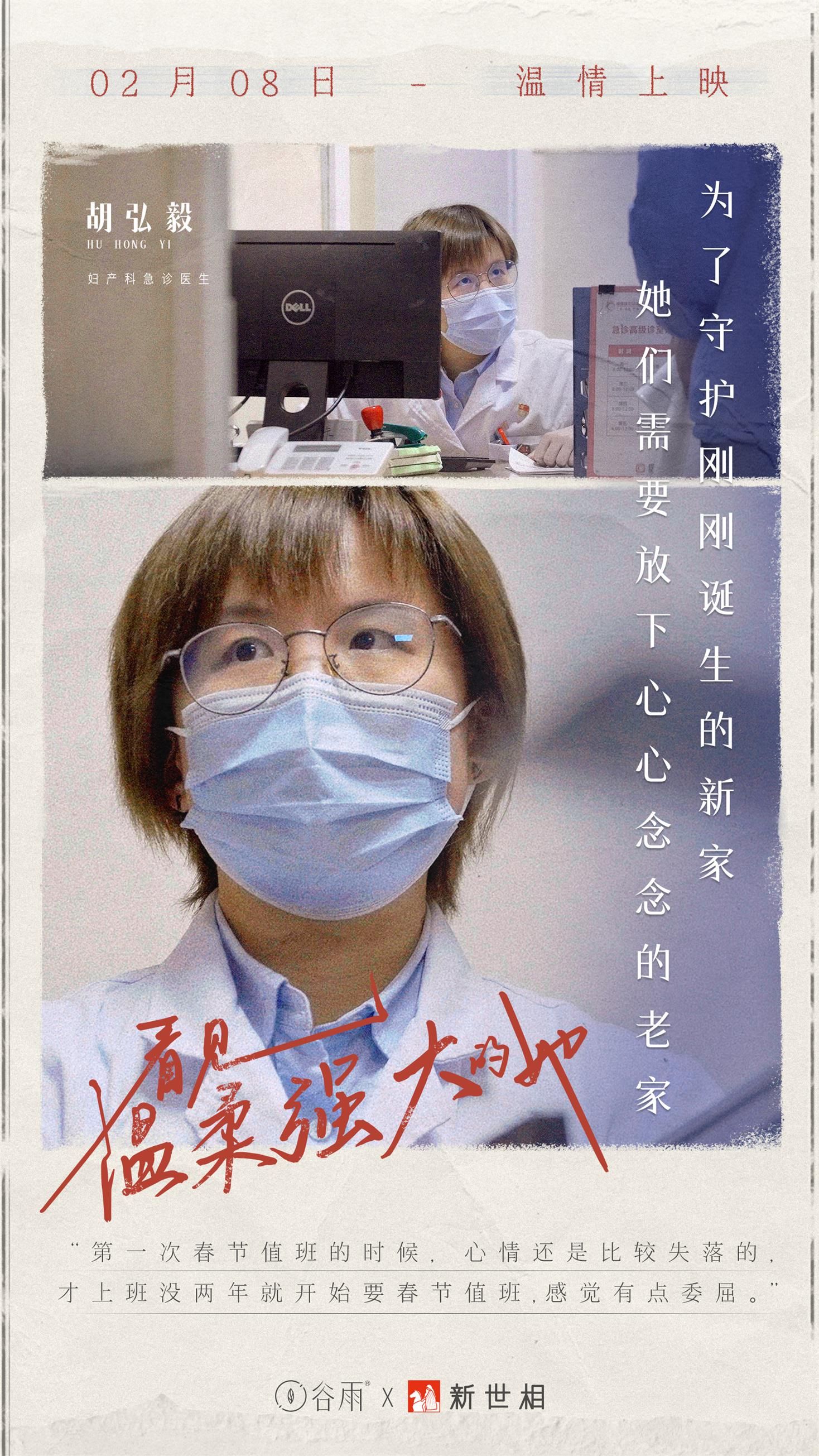 谷雨與新世相的鏡頭聚焦的三位女性工作者,她們來自不同行業不同崗位,但卻做出了同樣的春節堅守一線的決定。她們當中有為了守護剛剛誕生的新家,需要放下心心念念的老家的婦產科急診主治醫師;為了更好地照顧大家,無奈缺席自己的小家的養老院護工;還有為了讓我們看到萬家,輾轉新聞現場四海為家的電視臺記者。對她們而言,即將臨盆的產婦、時刻需要照顧的孤寡老人、亟待關注的新聞報道......這一份份沉甸甸的責任,讓她們選擇收起內心對家人的熱切思念,舍小家為大家,默默留守在自己的崗位上。