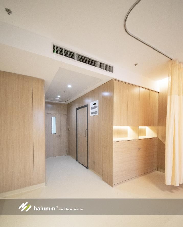 病房空間具有超強隔音和高標準防火性能,超56db隔音、120分鐘耐火等級,并選配漢爾姆自主創新的“百變場景墻柜一體化家具、背景聲樂療愈系統模塊、負氧療愈系統模塊、四級空氣消毒系統模”等快裝式系列產品,有利于醫生高效診治,有利于患者盡快康復。