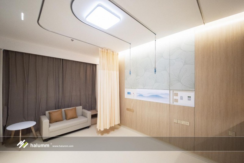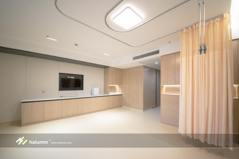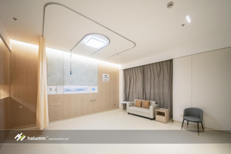 在VIP病房內,采用漢爾姆自主創新的“可拆裝式輕鋼骨架內隔墻成套核心集成技術體系”,高效整合管線、醫療設備等系統和產品,實現墻體與管線裝修一體化,與墻面齊平,不積灰、易清潔。同時可重復拆裝的室內非承重隔墻還具備出色的延展性,實現隱藏式墻體陪護床無縫切換,吊柜、臺盆柜、收納柜等多種墻柜一體的百變家具場景,以及電視等電子設備的一體化安裝,為患者及其家屬創造了一個美觀、整潔、舒適的就醫環境。
