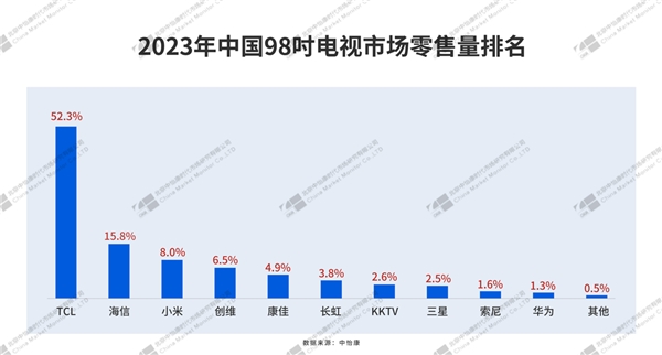 在Mini LED和超大屏電視市場,這三家中國品牌同樣表現亮眼。據中怡康數據顯示,2023年Mini LED電視中國市場零售量排名中,TCL以高達50.5%的市占水平穩居第一,海信與小米分別以21.2%和11.1%的市場份額,排名第二及第三。同時,2023年中國98吋電視市場零售量市場份額前三為TCL52.3%、海信15.8%、小米8%。