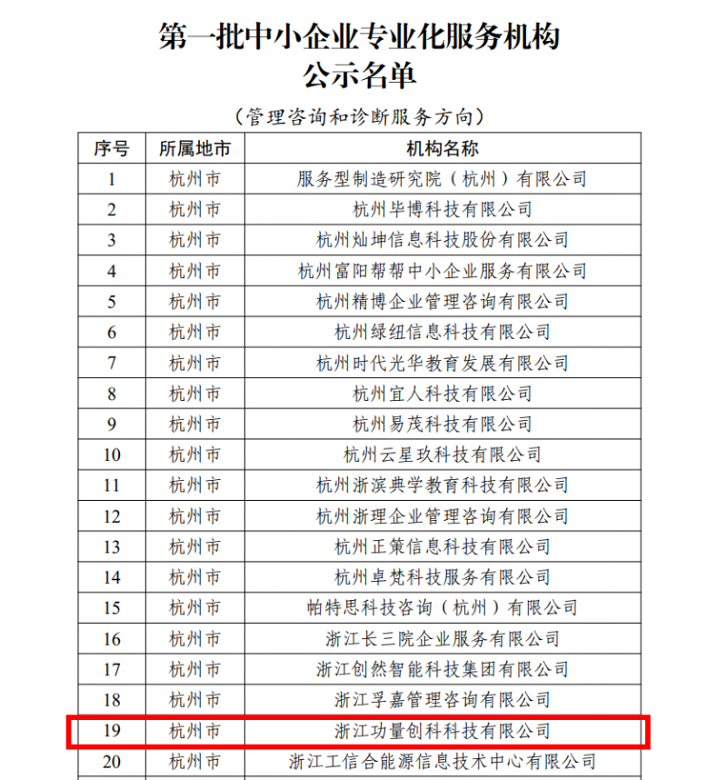 根據《浙江省經濟和信息化廳關于開展第一批中小企業專業化服務機構征集遴選工作的通知》,經機構自主申報、省級初審、地市經信部門審核、省級復審、專家評審,2024年1月31日,浙江省經濟和信息化廳公示了第一批中小企業專業化服務機構名單,浙江功量創科科技有限公司通過層層審核以及專家評審,成功入選浙江省第一批中小企業專業化服務機構。