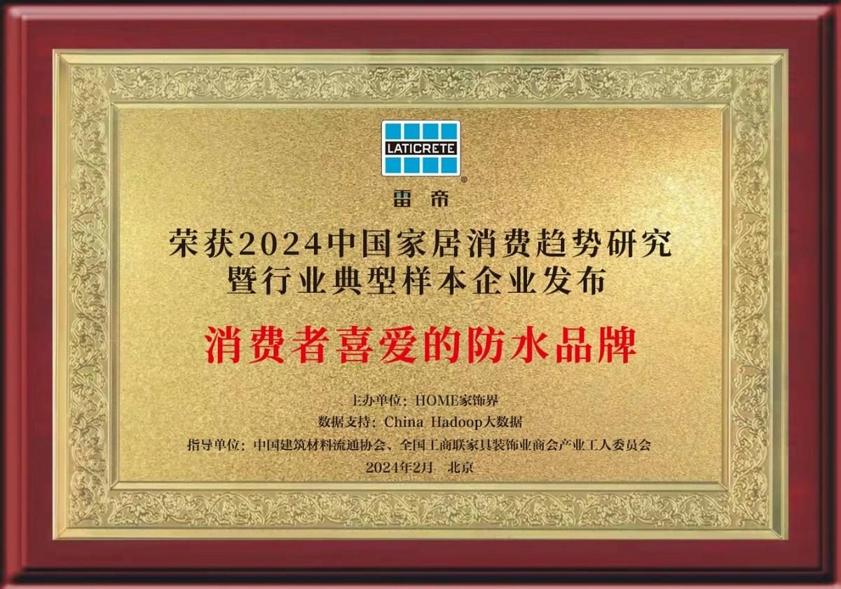 2024中國家居消費趨勢研究以“促進家居產業高質量發展,引領理性消費”為主旨,通過綜合網絡關注度、互聯網口碑評價、品牌銷售數據、銷售終端數據、消費者購買需求、業內人士意見、專業編輯測評、產品經營者消費趨勢調研、設計師產品口碑評價、產品使用口碑等十大指標,對相關行業領域進行定量與定性分析,得出專業性研究成果,并綜合各項數據與分析評選出消費者喜愛的行業品牌,通過客觀、專業的分析與指導將品牌推介給廣大消費者,在指導消費者消費的同時,建立行業標桿、樹立品牌意識,致力于使整個家居市場向著更加健康、規范的方向發展。此次雷帝再次榮獲“消費者喜愛的瓷磚膠品牌”、“消費者喜愛的防水品牌”、“消費者喜愛的填縫劑品牌”殊榮,更是從眾多品牌中脫穎而出。