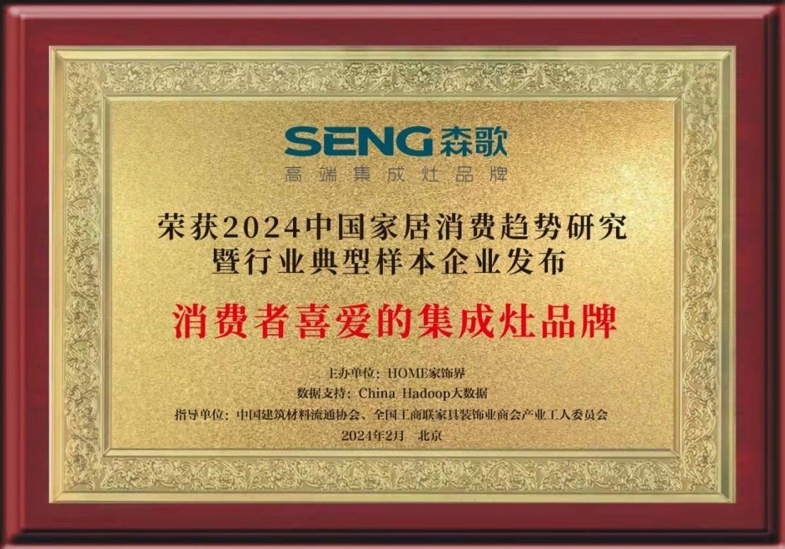 2月29日,由中國建筑材料流通協會、全國工商聯家具裝飾業商會產業工人委員會、China Hadoop大數據、HOME家飾界聯合發布“2024中國家居消費趨勢研究暨行業典型樣本企業”研究成果,森歌集成灶以杰出的行業影響力成功入選“中國家居消費趨勢研究廚電行業典型樣本企業”,并榮獲“消費者喜愛的集成灶品牌”榮譽。不僅是對森歌冠軍品牌的有力證明,更是對森歌冠軍實力和創新能力的充分肯定。