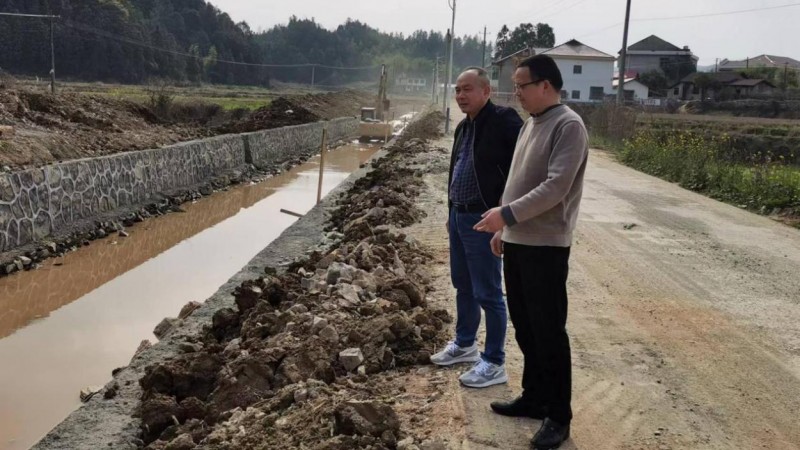 (劉家斌與駐村干部查看溝渠提質改造工程質量)