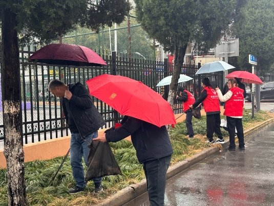 圖為“香溢”志愿者冒雨撿拾道路垃圾