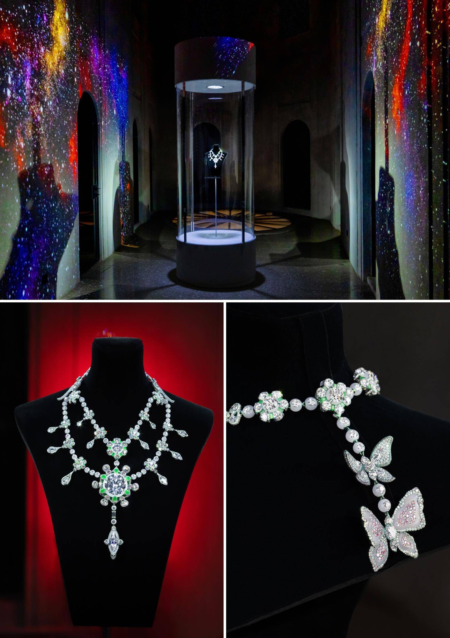 沿著展區中心的旋轉樓梯拾級而上,觀者可從星河流轉的世界來到充滿自然氛圍的二樓空間,生機盎然的綠植與別致巧妙的鏡面裝置點綴四周。掩映在這綠色綺境中的,是散發出煜煜光華的周大福高級珠寶作品。育自天然的鉆石顆顆煥彩,帶著無瑕光澤被巧妙地融入珠寶創作中,共同譜奏出斑斕華美的樂章。