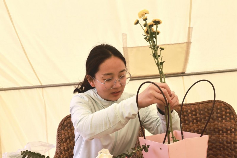 (圖為:青年女職工認真插花 蔣銳童 攝)