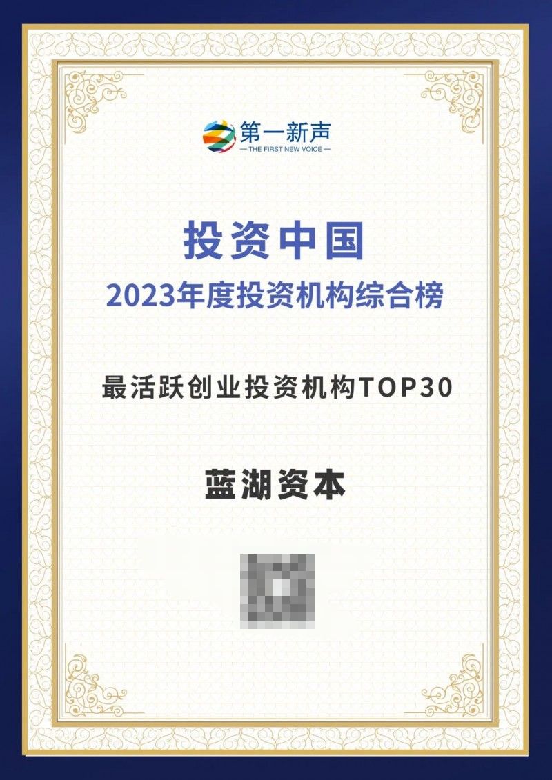 3月6日,第一新聲發布「投資中國-2023年度中國投資機構系列榜單」,藍湖資本榮登「2023年度中國投資機構綜合榜最活躍創業投資機構TOP30」。