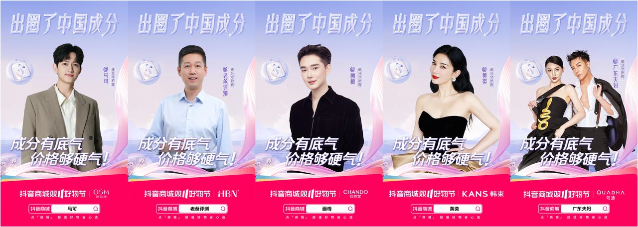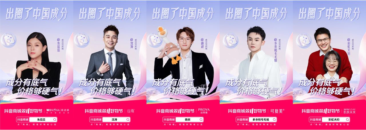 抖音電商還利用了全域興趣電商的生態優勢,雙十一期間聯動一眾KOL,邀請他們參與活動傳播、進行成分種草,有效聚攏人群流量,放大品牌勢能。@馬可、@老爸評測、@畫梅、@黃奕、@廣東夫婦、@朱瓜瓜、@沈濤、@萌叔、@多余和毛毛姐、@彩虹夫婦十位達人,化身「成分守護官」,在分享健康護膚方式的同時,為國貨品牌成分發聲,介紹中國成分的價值與力量。
