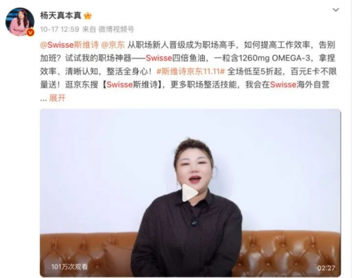 為了深入職場年輕人的精神陣地,構建高度的圈層認同。17日, Swisse斯維詩誠摯邀請金牌經紀人、職場高能量女性——楊天真,化身“Swisse首席加油官”,結合職場問題,通過微博視頻為粉絲答疑解惑,呼吁職場群體注意健康防患,適當補充營養,做有元氣、有發量、有腦力、有眼力的“四有職場人”。