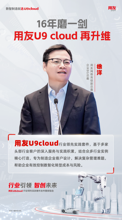 16年磨一劍,用友U9 cloud再升級!最后,徐洋也表明了用友的態度,U9 cloud將繼續深耕細分行業,積極完善海外服務場景,發布更多行業套件,用數智技術為企業客戶的全球成功加速助力。他呼吁與會嘉賓、合作伙伴和客戶攜手并進,共同推動中國制造業數智化升級,服務中國制造業全球化經營。